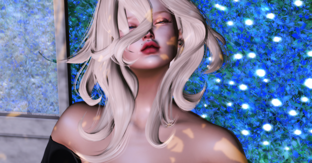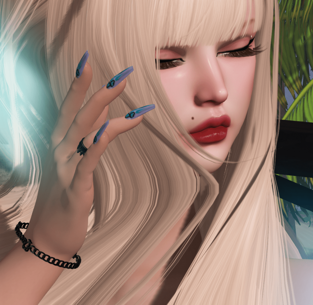 -Thia squints her purple eyes with long eyelashes, her soft, long and messy pink hair falls over her shoulders, framing her face with a perfect complexion.