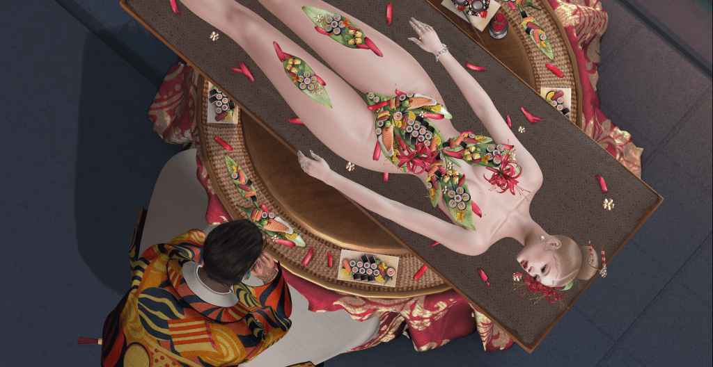Thia nods and without asking for explanations retreats to her room. She chooses to wear an excellently tailored candy pink dress with an ornamental mother-of-pearl design designed to enhance the perfect female figure.